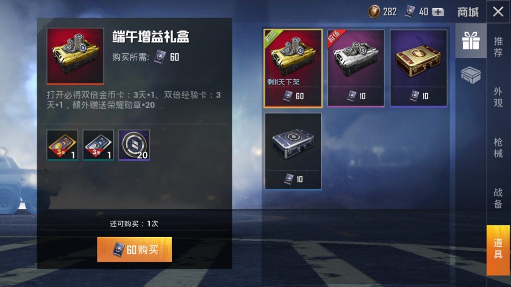 就像刚上线就火起来的 平和精英,也不免俗地在刚过去的端午节推出限制增益礼盒。礼盒限时于6月7日到6月21日上架,里边有双倍金币卡、双倍经历卡等超值产品。里头的产品由于价值高,本就招引不少玩家购买。别的加上礼盒仅仅限时上架几星期,所以玩家们都不甘落后与他人,把握机遇下手礼盒。